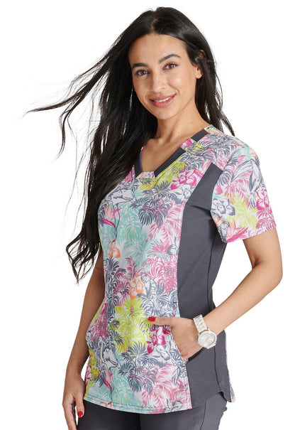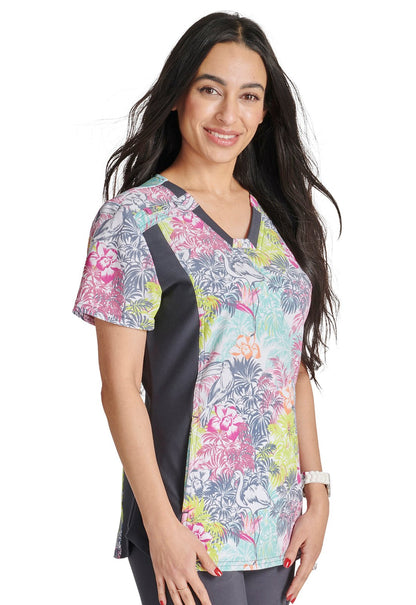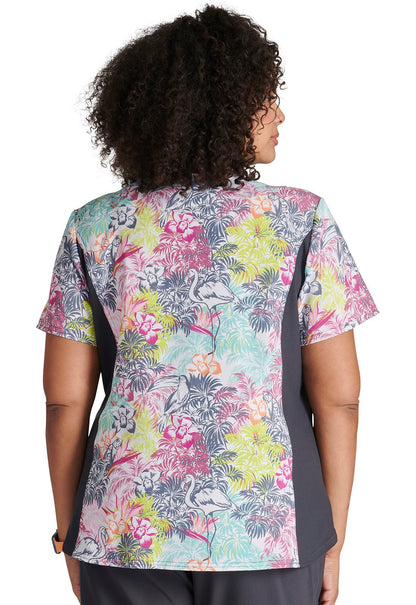 Birds Of Paradise Cherokee iflex Print V Neck Knit Panel Scrub Top CK641 BIPD