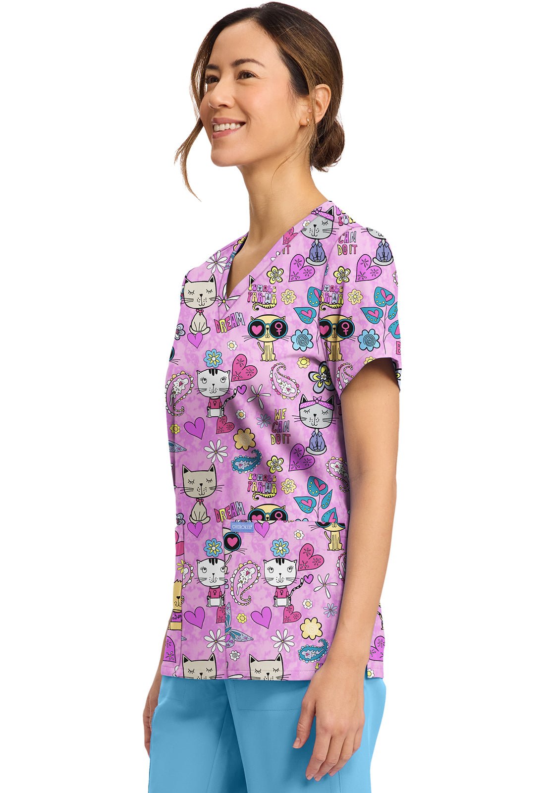 Feline Female Cherokee Scrubs Cat Print V Neck Top CK856 FIFM