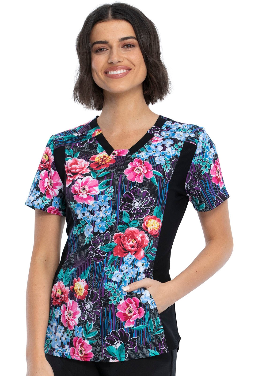 Cherokee iFlex V Neck Knit Panel Top in Flower Tech