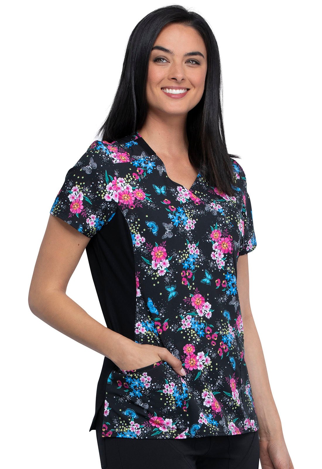 Floral Cherokee iFlex Print Mock Wrap Knit Panel Scrub Top CK642 AMTW