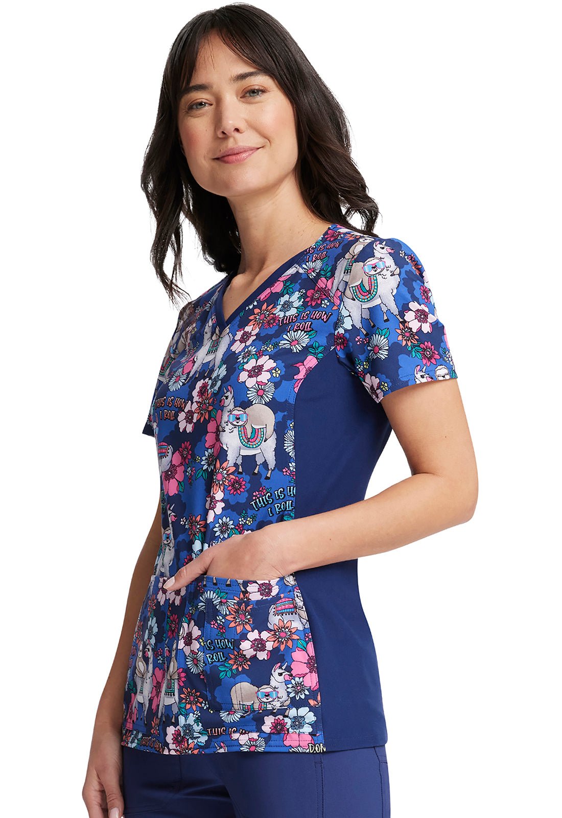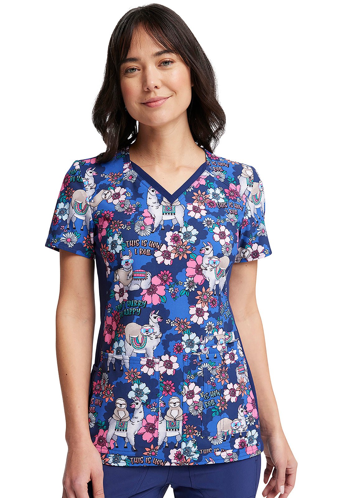 Llama Sloth Cherokee iFlex Print V Neck Knit Panel Scrub Top CK636 HYPL