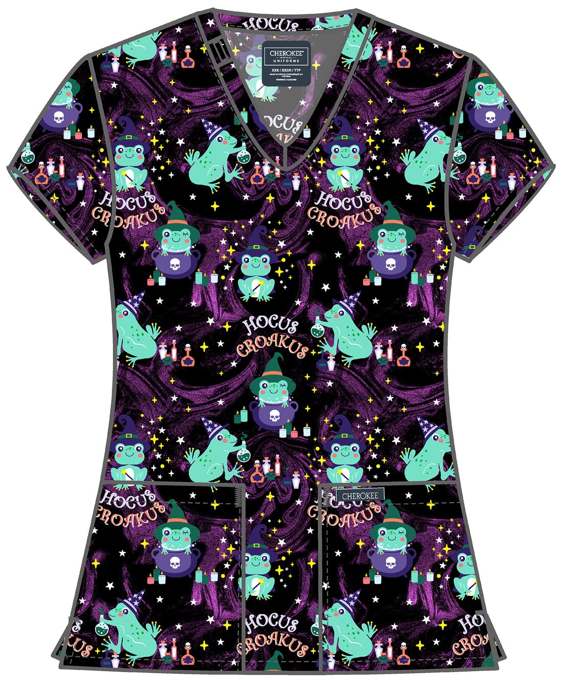 Hocus Croakus Cherokee Scrubs Frog Halloween Print V Neck Top CK856 HCCK