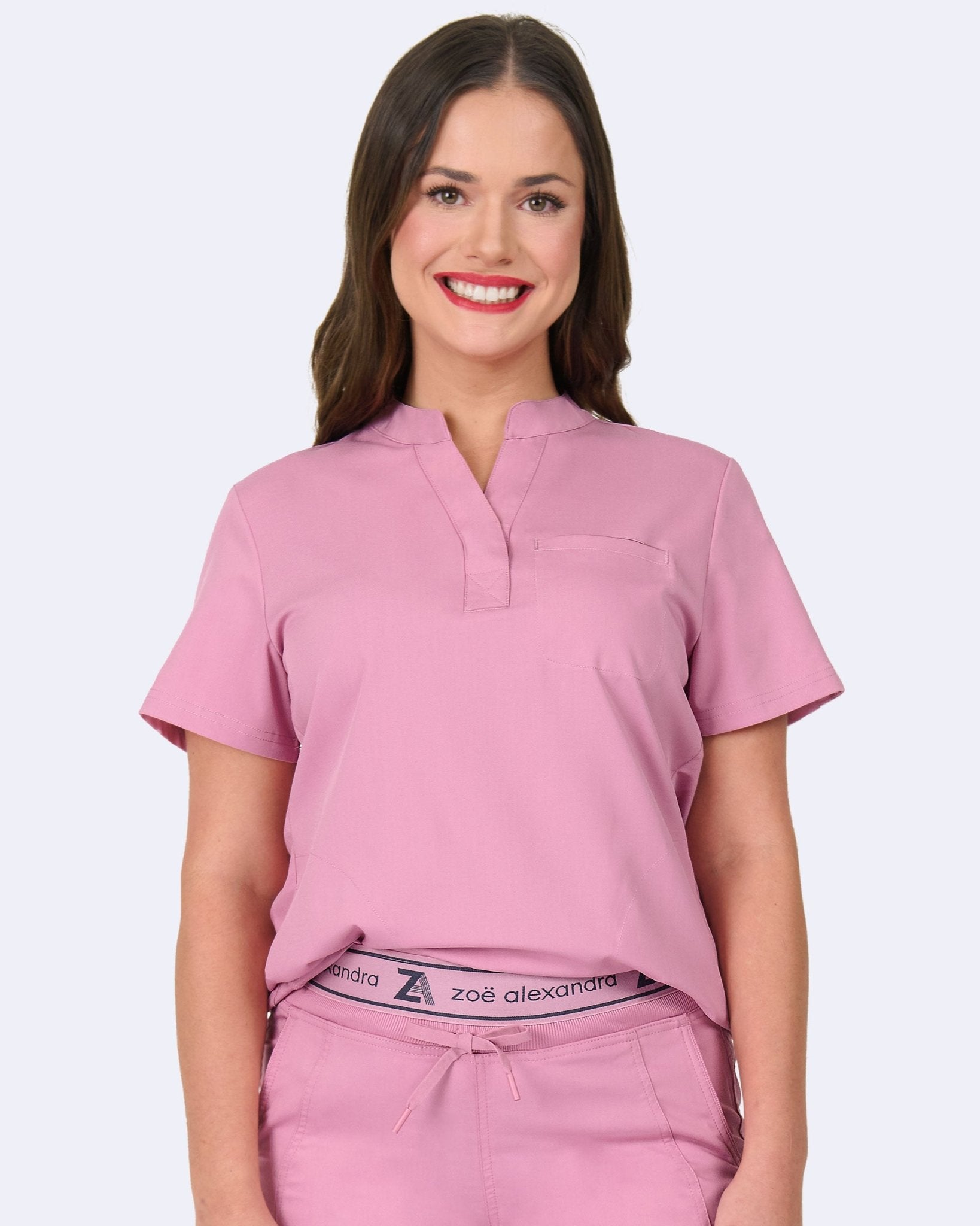 Zavate Chelsea Tuck in Scrub Mandarin Collar Top 1132 Dusty Rose, Red, Sea Foam